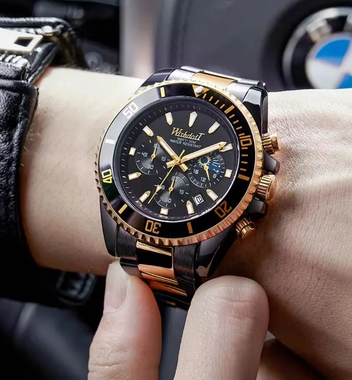 Eleva tu estilo con nuestro Reloj de Hombre Impermeable Negro y Dorado con Cronógrafo. Diseñado para el hombre que valora tanto la estética como la durabilidad, este reloj es una combinación perfecta de lujo y funcionalidad. La elegante caja y correa en tonos negros y dorados crean un look impresionante y sofisticado.